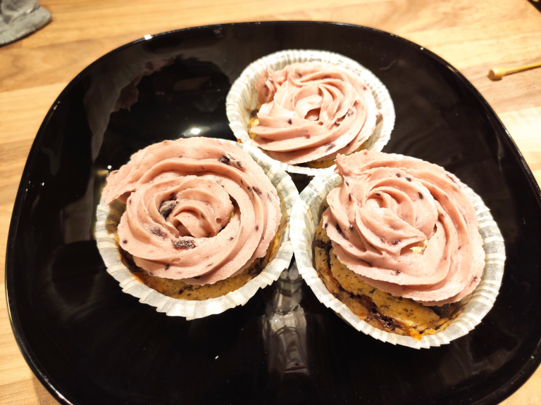 Glasuren påføres kagerne, f.eks. med sprøjtepose+tylle eller forsigtigt med en smørekniv.