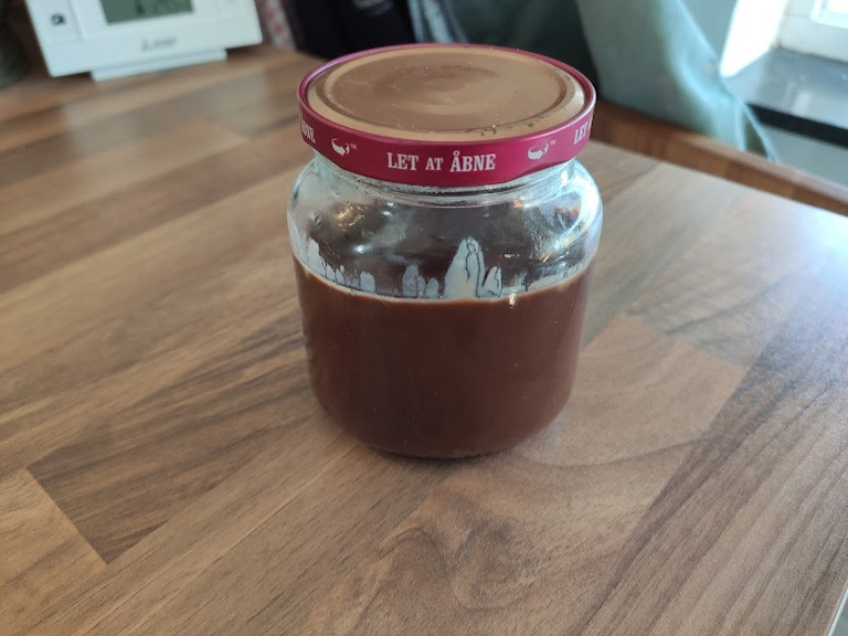 Opbevar chokoladen i glas ? det skal ikke stå i køleskabet, altså hvis man gerne vil kunne smøre det på, for det bliver pænt hårdt.