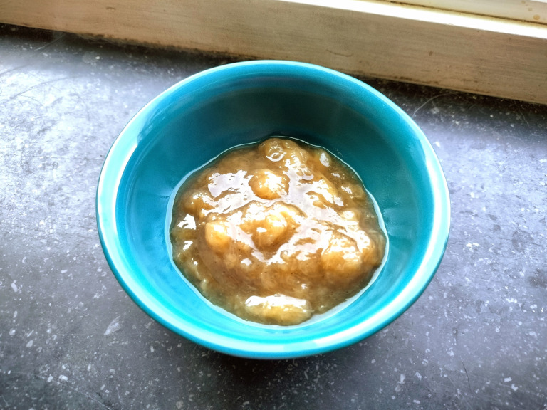 Tilsæt kanel, vanijlestang og banan og lad simre indtil bananstykker næsten er kogt ud - ca. 40 min.