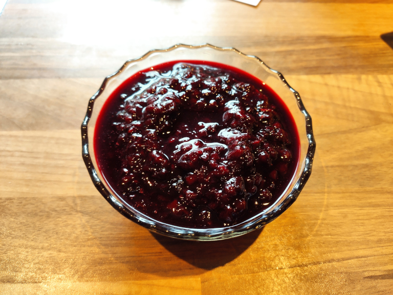 Brombær, vanilje og vand bringes i kog og koger indtil bærrene er kogt til en passende konsistens.
