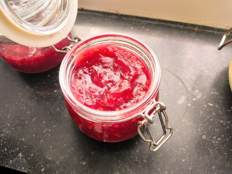 Hindbær, æbler og vand bringes i kog og koger indtil æblerne er kogt til mos.