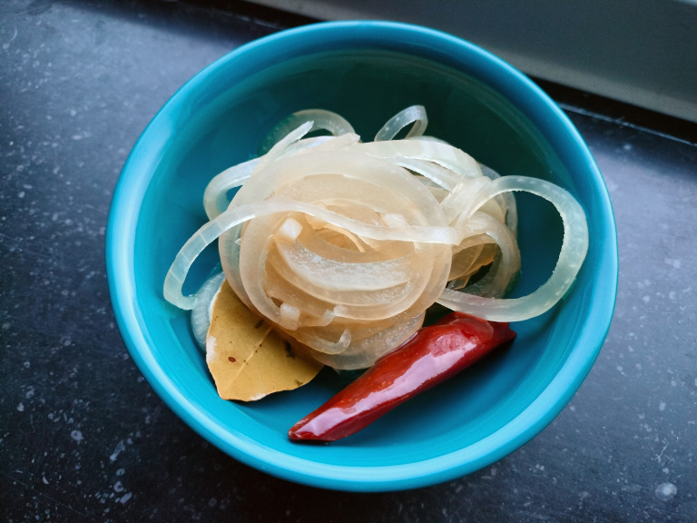 Lagen tages af varmen og tilsættes evt. atamon, hvorefter det hældes over løgskiverne. Låg på og lad afkøle før brug.