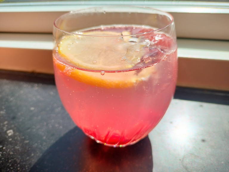 Hæld gin, strikkelsbærsirup og citron i et glas.