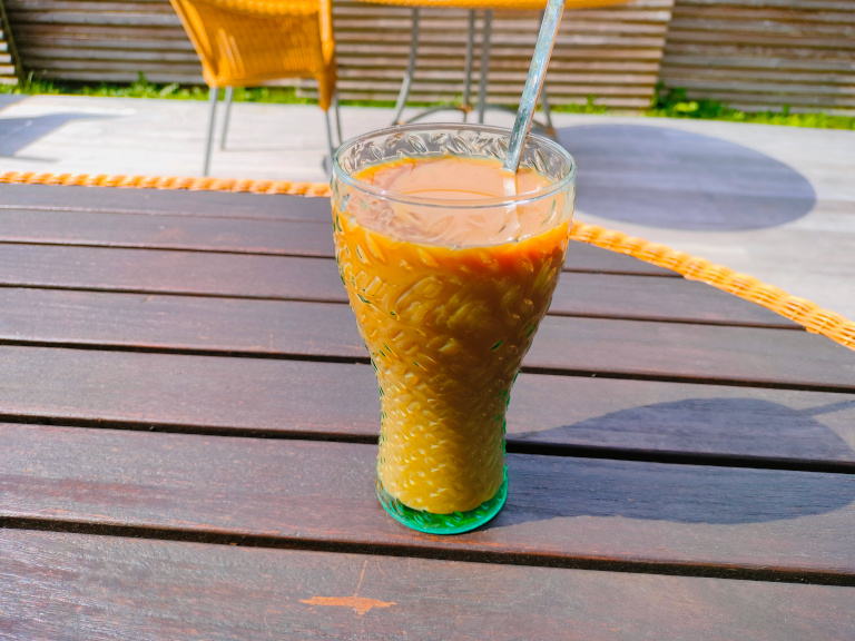 Bryg kaffen, sød den med sukkeret og stil til afkøling (evt. med en isterning, hvis man ikke har tid til at vente).