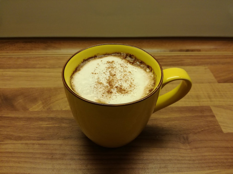 Farin og kanel hældes i en kop. Kaffen hældes over og rør indtil sukkeret er opløst. Mælken skummes i en mælkeskummer.