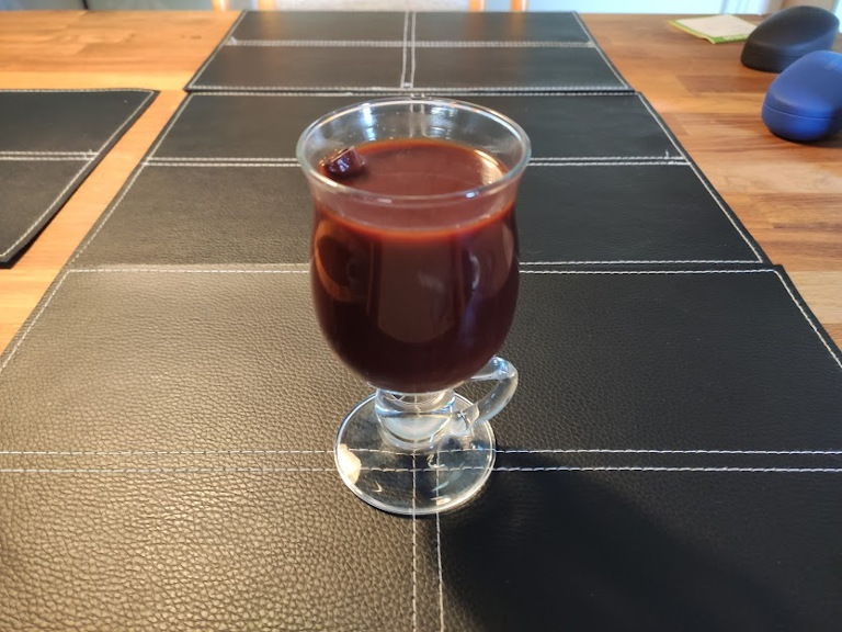 Kakao, sukker og kanelstang hældes i en kop. Kaffe brygges og hældes i koppen. Rør evt. med kanelstangen.