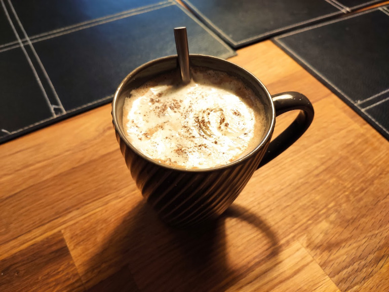 De to væsker piskes, hurtigt sammen. Hældes i en stor kop der kan rumme 3½-4 dl. En kanelstang tilsættes og skummet placeres og til sidst drysses muskatnød forsigtigt på.