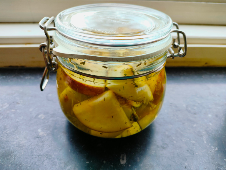 Alle 4 ingredienser anbringes i et glas, en flaske eller anden egnet beholder.