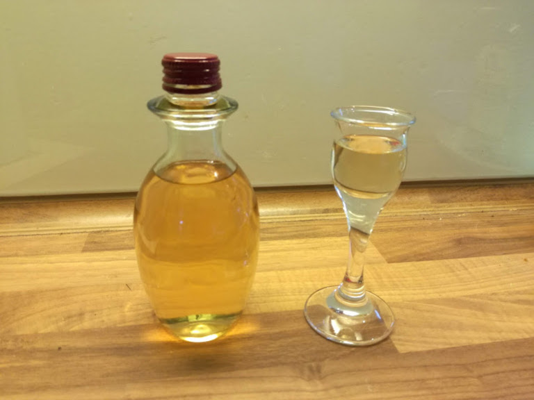 Lad trække i 4-6 dage, hvorefter snapsen drænes og hældes på flaske.