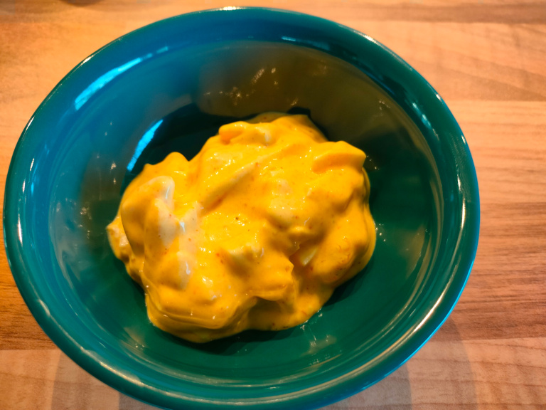 Creme fraiche, mayonnaise, karry og gurkemeje røres godt sammen.