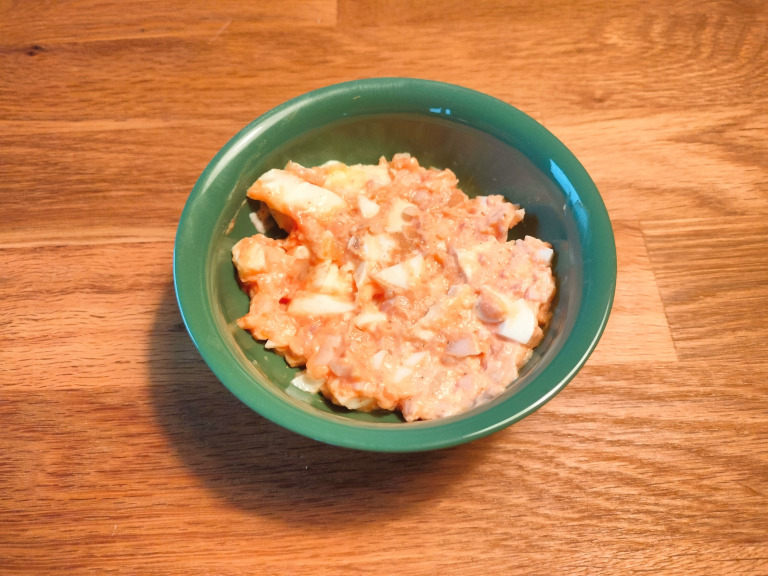 Fisk og æg hakkes i mindre stykker - ved håndkraft. Hvis salaten hakkes for voldsomt, kan den blive flydende.
