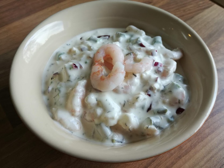 Creme fraîche, mayonnaise, dild, løg og sennepspulver røres sammen.