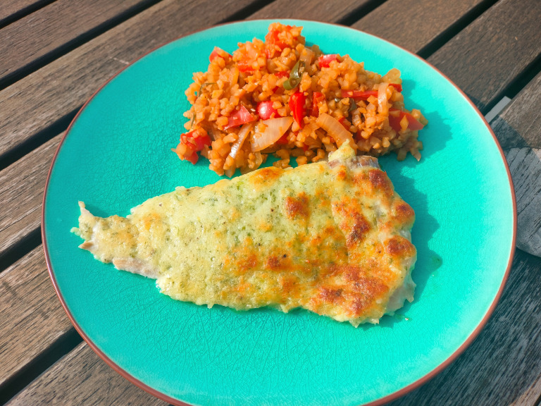 Forårsløg, smør, olivenolie, hvidløg, mozzarella og basilikum blendes godt sammen og smøres ovenpå fisken.