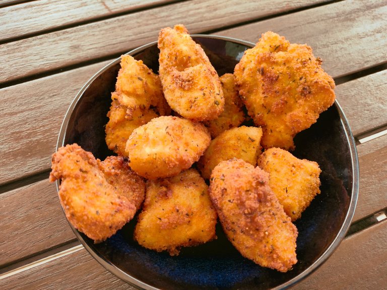 Olien varmes op i en pande, og fiskestykkerne steges sprøde og gyldne heri - sørg for at de ikke rører hinanden, når de føres over i panden, for at undgå at de klistrer sammen.