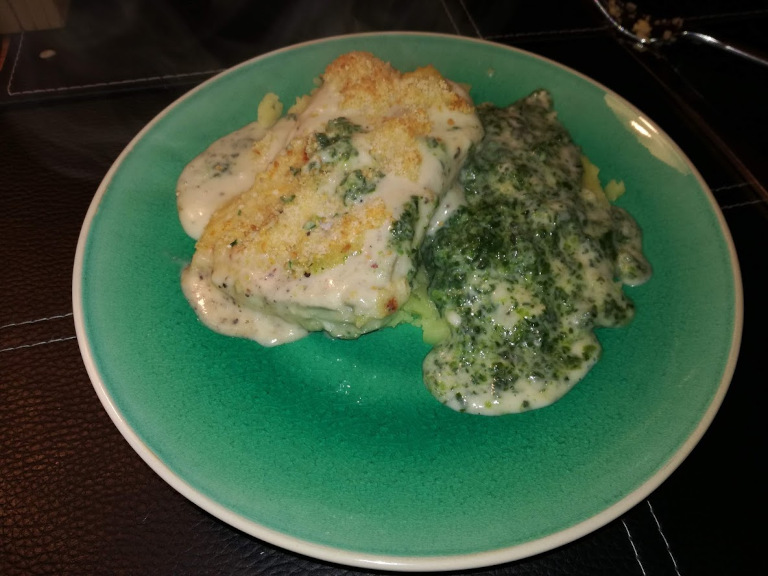 Fiskestykkerne lægges ovenpå spinaten og krydres med salt og peber.