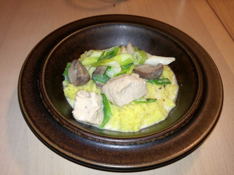 Tilsæt fløden, forårsløgene og champignonerne og retten varmes godt op.