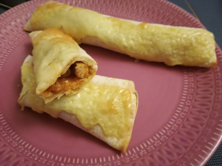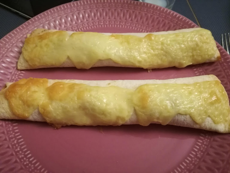 Pandekagerne rulles sammen, lægges ? oven på lukningen ? i et ildfast fad og drysses med osten.