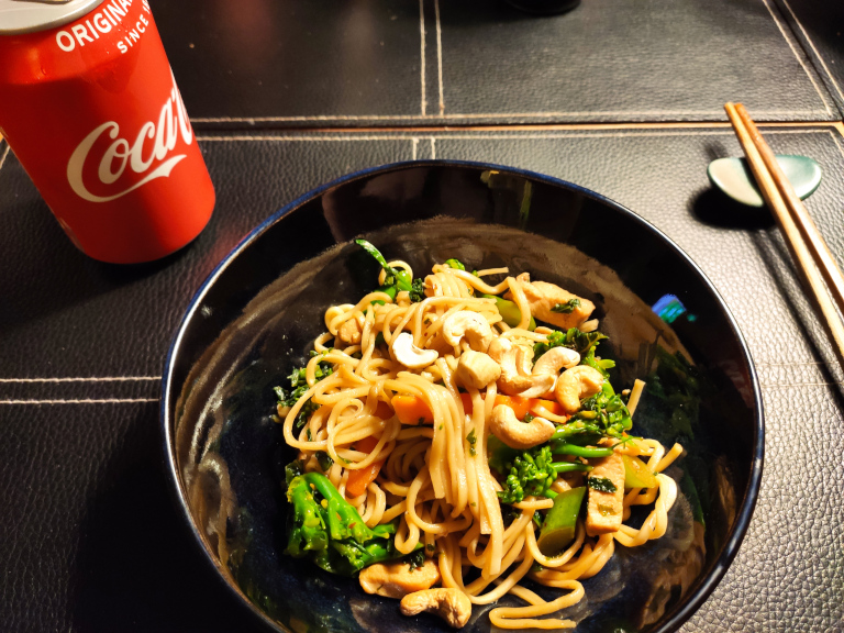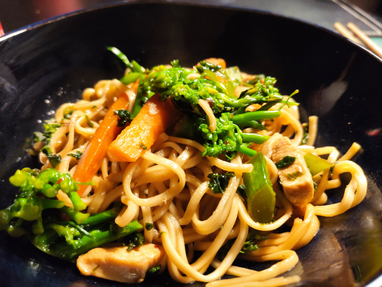 Tilsæt nudlerne til wokken og vend godt rundt i retten: