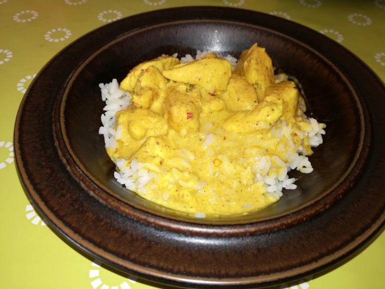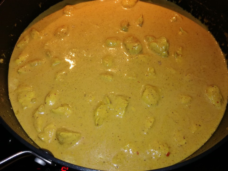 Kylling og marinaden hældes over i en pande og steges indtil kødet er mørt - stil til side.