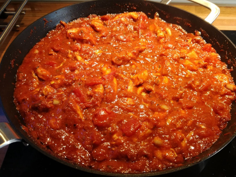 Hvidløg, chili, paprika, spidskommen, koriander, oregano, sukker, salt og tomatpuré tilsættes, og massen svitses i 3-4 min.