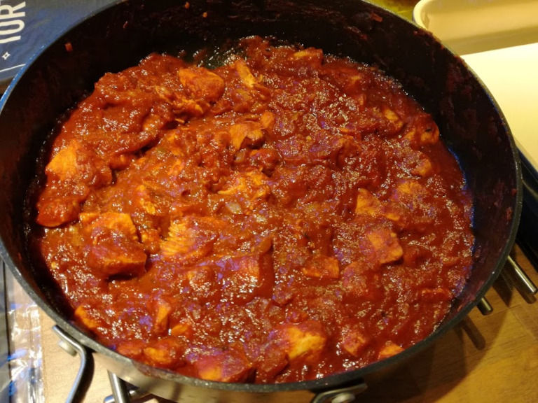 Kødet og salsa tilsættes og steger med indtil kødet er mørt.