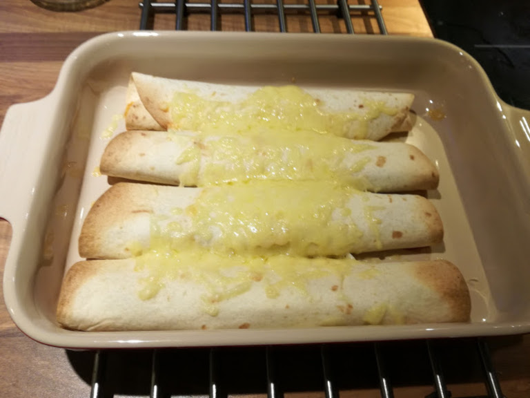 Pandekagerne fyldes med kødet, 2 tsk. cremé fraîche hver og lidt cheddarost. Rulles sammen og lægges på samlingen i et smurt ildfast fad.