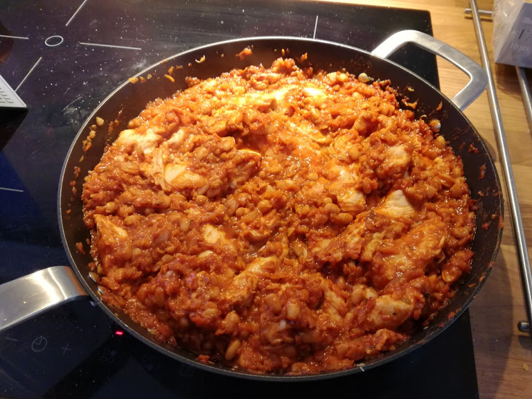 Kødet og bønner tilsættes og steger med indtil kødet er mørt.