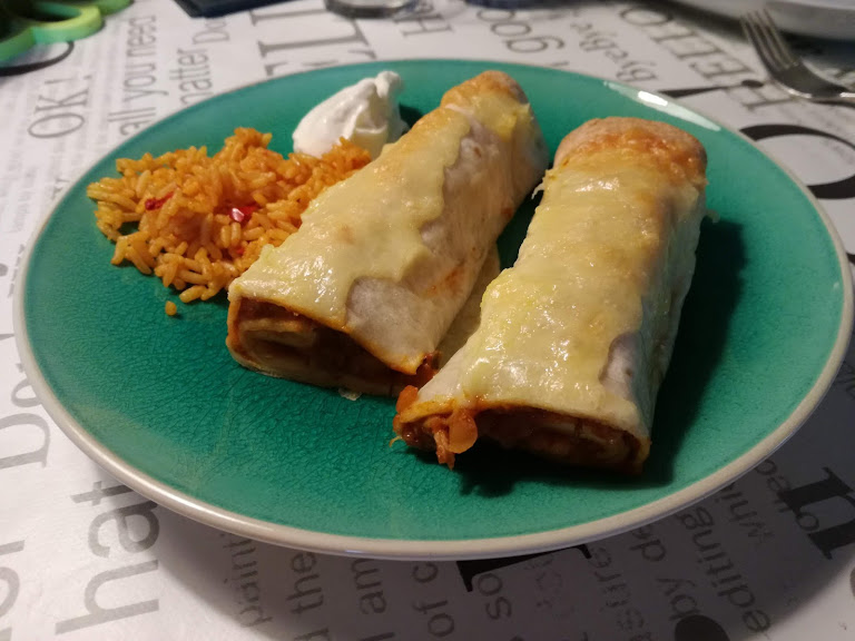 Pandekagerne fyldes med kødet, 2 tsk. cremé fraîche hver og lidt cheddarost. Rulles sammen og lægges på samlingen i et smurt ildfast fad.