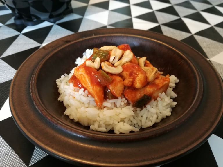 Olien varmes op i en wok. Hvidløg, chili og ingefær svitses godt i olien, og derefter tilsættes kyllingekødet, der steges indtil gyldent.