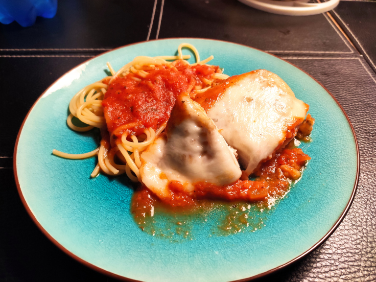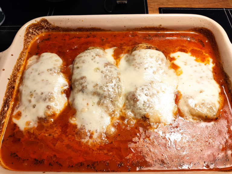Saucen hældes i et ildfast fad, de stegte kyllingestykker lægges ovenpå, mozzarellaosten placeres på kyllingekødet og fadet stilles i ovn ved 200° indstil osten er smeltet.