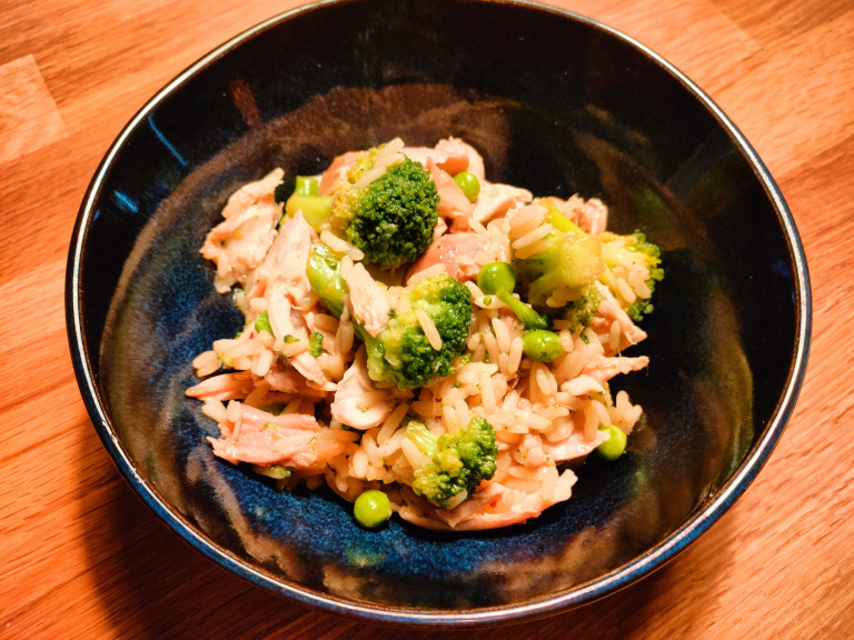 Saucen tilsættes ærter og broccoli og lad varme godt igennem.