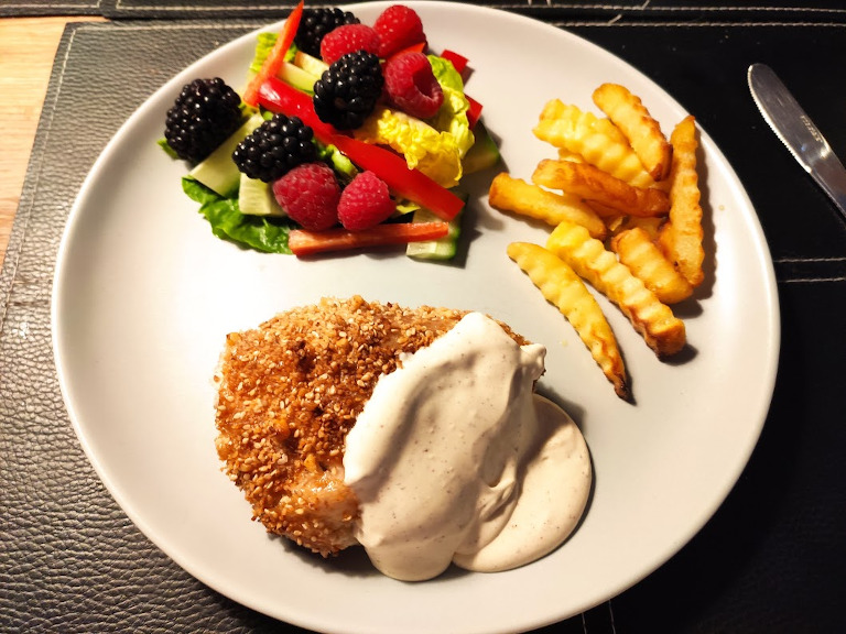 Kartofler eller pommes frites egner sig fint til denne ret.