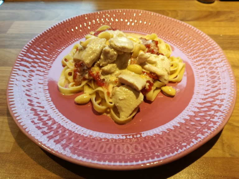 Pastaen koges, sigtes og anrettes på 4 tallerkner. Tomatsauce fordeles oven på pastaen og til sidst fordeles kyllingesaucen øverst.