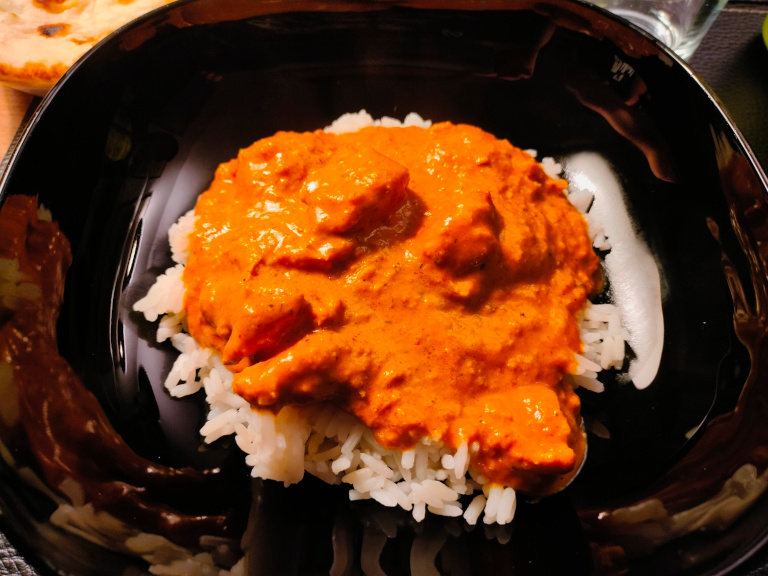 Server med kogte ris og evt. naanbrød.