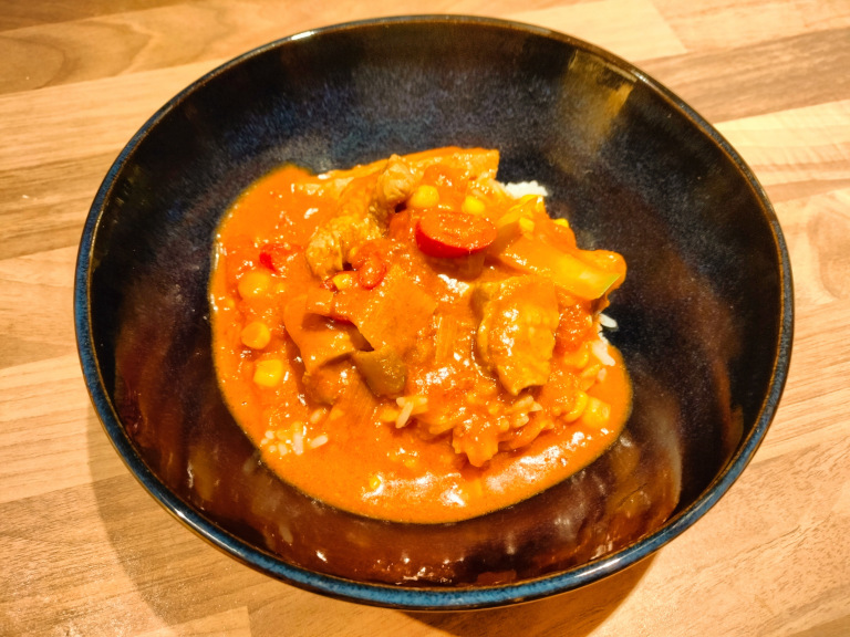 Kokosmælk, majs, porre og tomat tilsættes og retten småsimrer i 6-8 min.