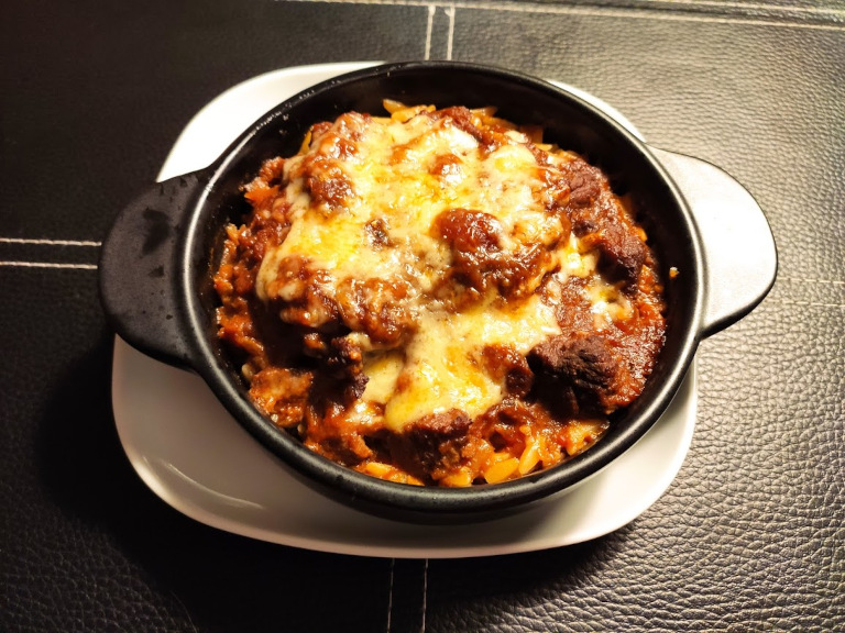 Pastaen fordeles i bunden af et ovnfast fad eller ovnfaste portionsskåle, kalveragouten fordeles ovenpå og det hele sluttes af med revet ost.
