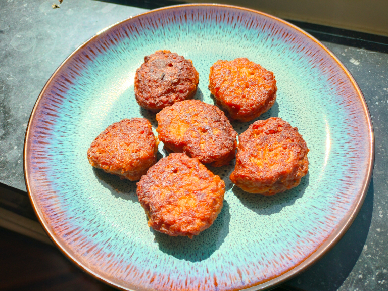 Farsen formes til frikadeller, der steges i olien på en varm pande.