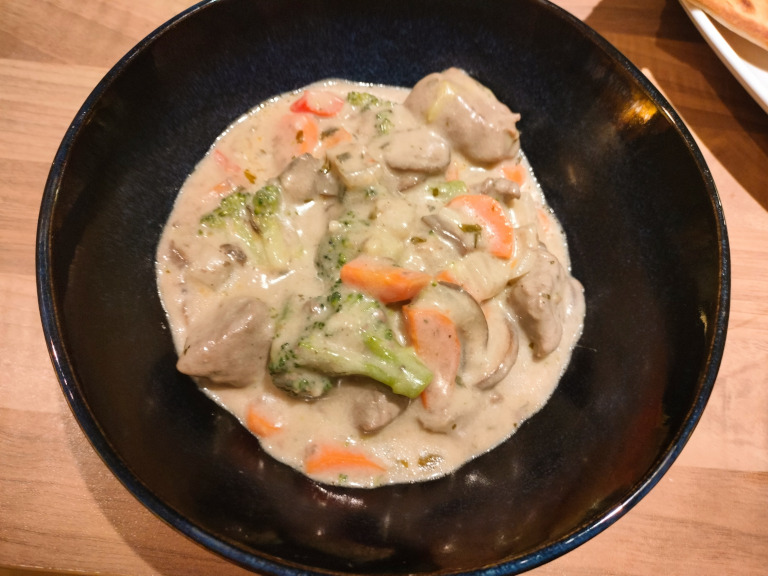 Gulerødder, broccoli, fløde, salt og ramsløg tilsættes. Læg låg på og lad det simre i 10 min.