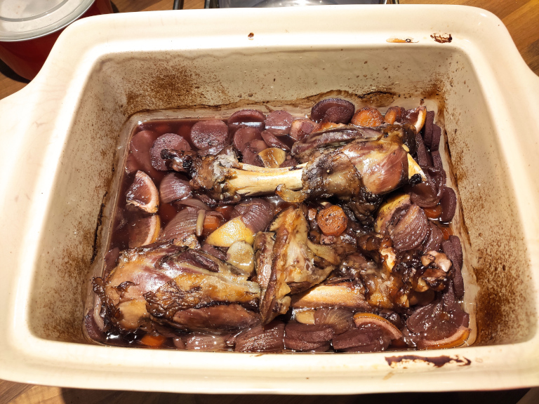 Fadet dækkes til / læg låget på stegesoen og stil i ovn ved 150° i 2½ time.