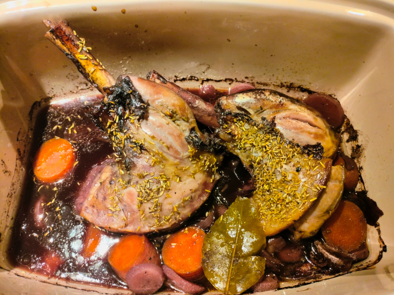 Fadet dækkes til / læg låget på stegesoen og stil i ovn ved 150° i 2½ time.