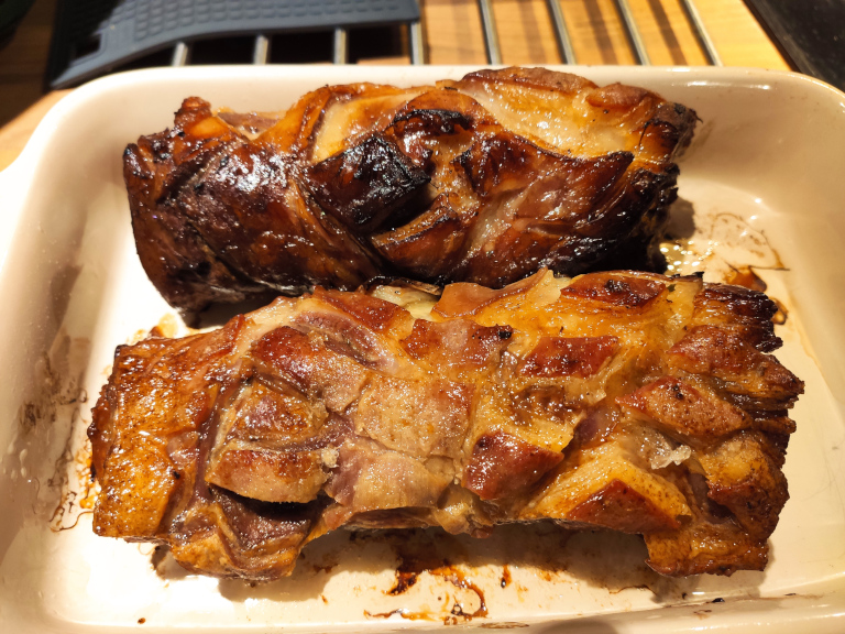 Derefter tages kødet op af lagen og stilles under grill i 5 minutter - indtil fedtet danner sprødt krølfedt.