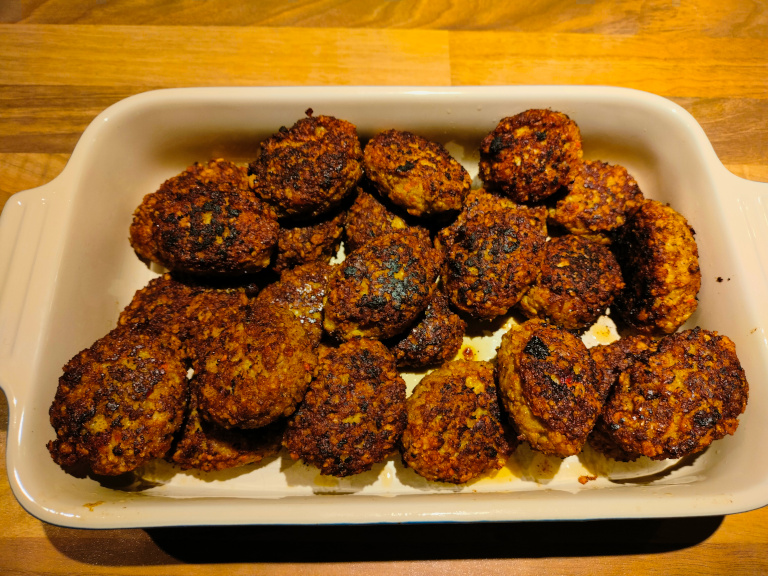 Farsen formes til frikadeller, der steges på en varm stegepande.