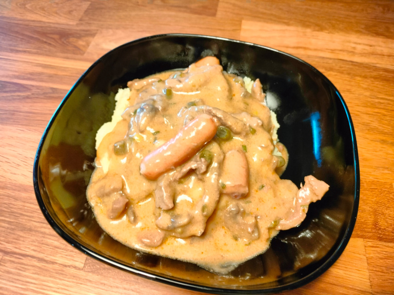 Bouillon og creme fraîche tilsættes og retten bringes i kog.