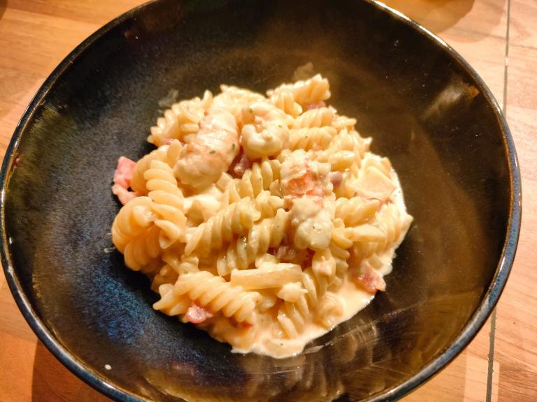 Fettuccine, bacon+hummer, parmesanost og persille tilsættes - rør godt rundt indtil osten er smeltet.