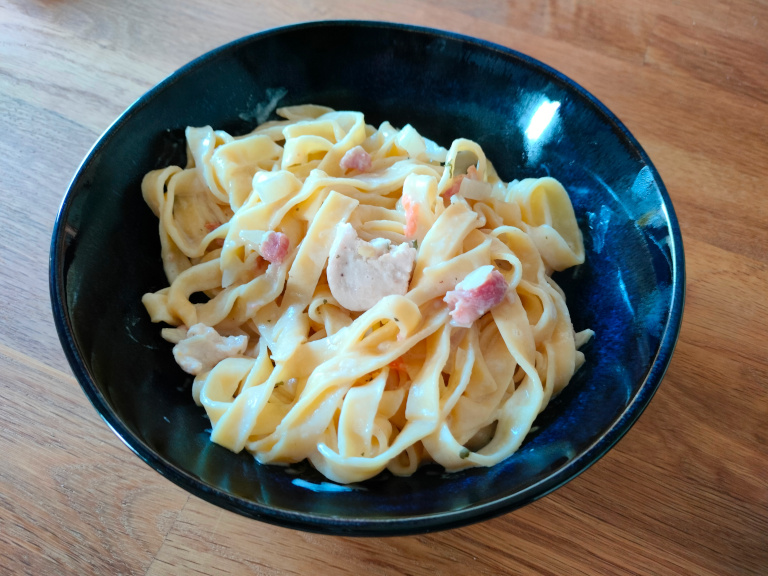 Fettuccine, bacon+kylling, parmesanost og persille tilsættes - rør godt rundt indtil osten er smeltet.