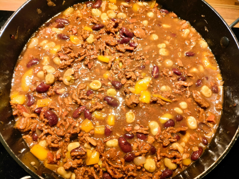Bouillon og bønner tilsættes og lad simre i 15 min - smag til med soja, salt og peber.