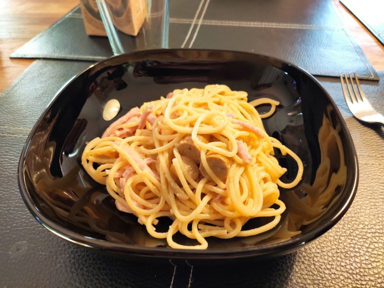Fløde og æggeblommer piskes godt sammen og varmes op uden at koge.