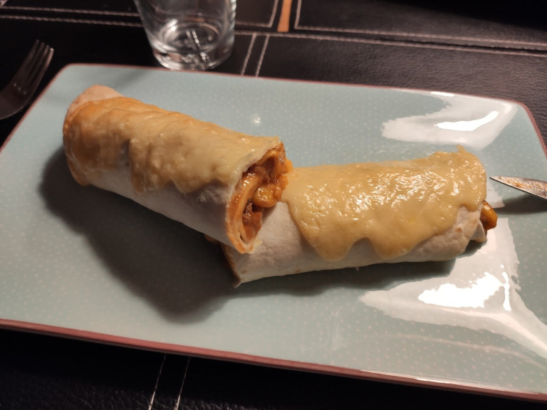 Kødet fordeles på pandekagerne sammen med halvdelen af osten. Pandekagerne rulles sammen og lægges - ovenpå samlingen - i et smurt ildfast fad. Resten af osten drysses over pandekagerne, der gratineres i ovn ved 200° i ca. 10 min.