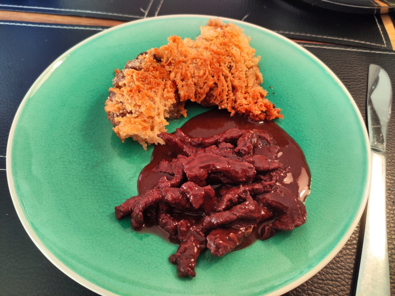 Kødet hældes tilbage i saucen, der tilsættes evt. andefedt, fløde og smages til med peber.