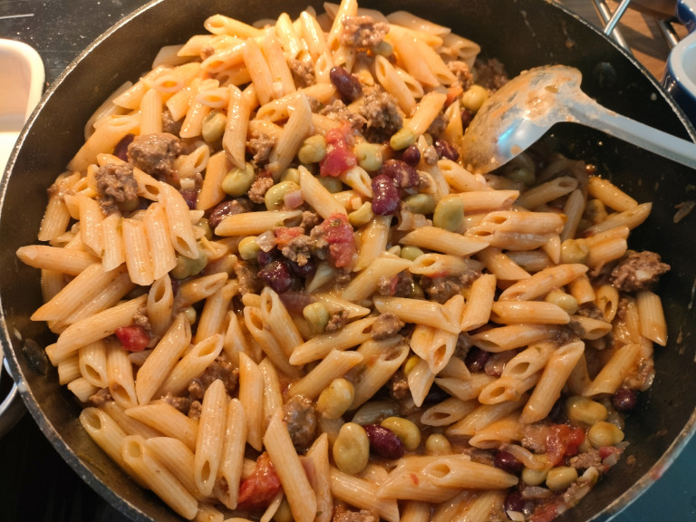 Før vandet hældes fra pastaen, tager man ca. 1-1½ dl af pastavandet og hælder over til kødsaucen - dette giver lidt stivelse.